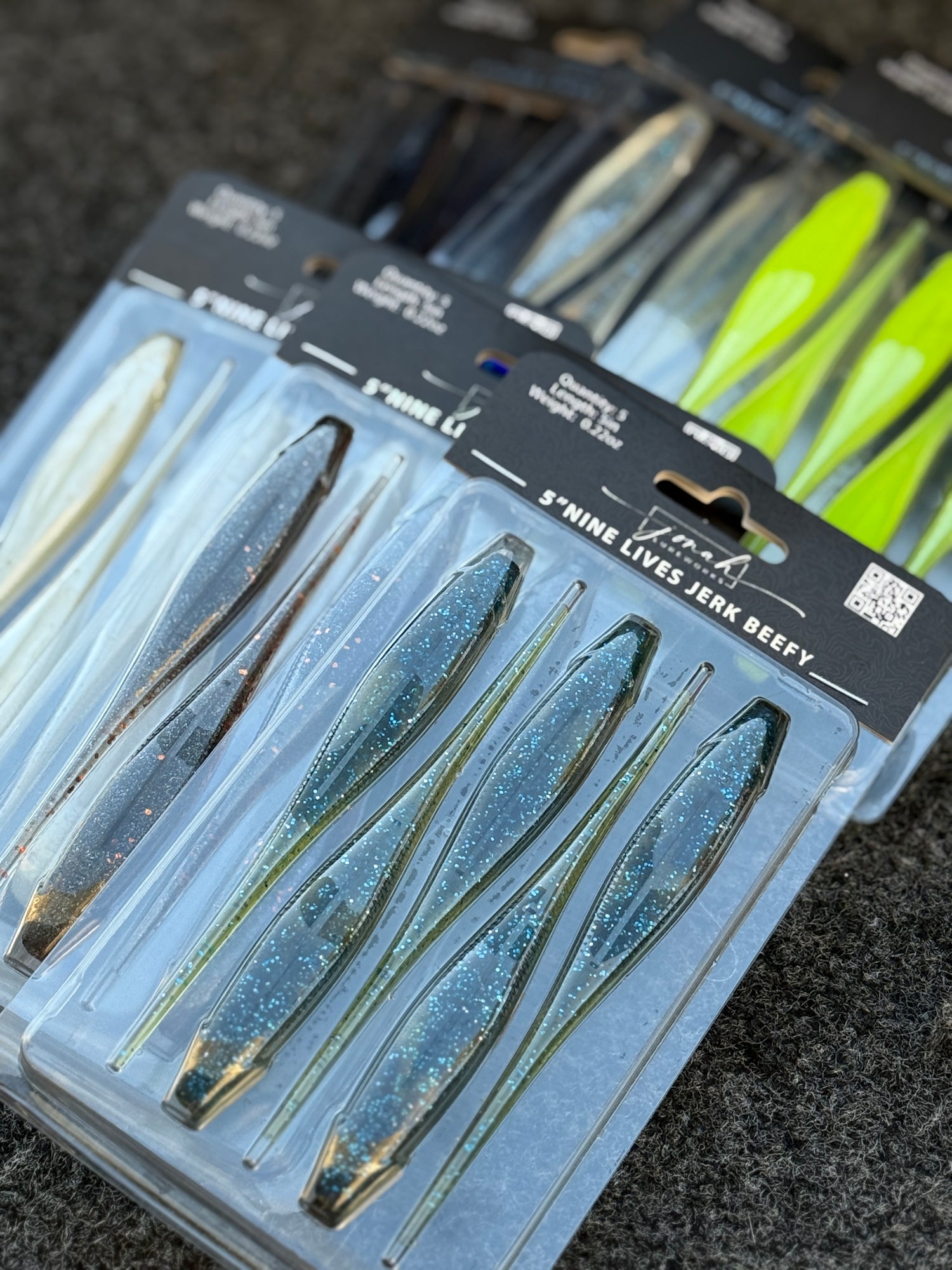 The Jerk Beefy is crafted from our NINE LIVES™ material and infused with our custom formulated DSS scent. Depending on the terminal tackle weight, this ultra durable jerk bait can be presented top water, suspending, slow or fast sinking and with quick, short twitches a "walk the dog" presentation can be achieved both top water and sinking. Rig it with wide gap hooks or barbed jig heads for both fresh and salt water